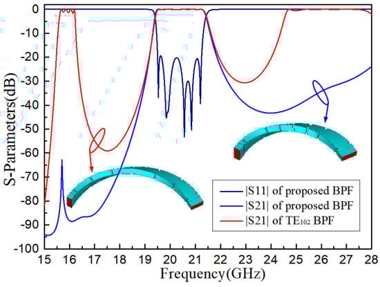 S-parameters of the proposed BPF compared with the TE102 BPF.