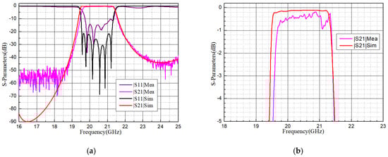 Measured results were obtained by a network analyzer, and the S-parameters are pictured in Figure 9, compared with simulations. A shift in the center frequency (Δf0) of about 100 MHz (0.5%) toward higher frequencies can be observed. The return loss (RL) in the passband is better than 10.37 dB. And, the insertion loss (IL) in the passband is about 0.31 dB on average and lower than 0.94 dB, while the simulated IL is about 0.46 dB. In general, the measurements show good consistency with the simulations.