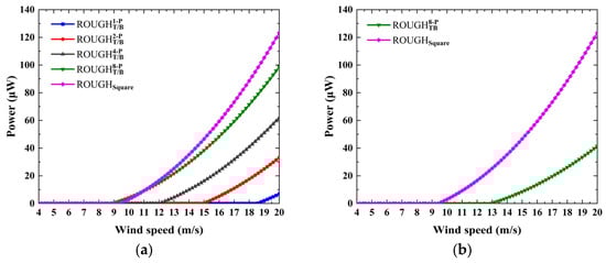Conversely, an important performance improvement comes from the depressed features, as shown in Figure 10c,d. First, the critical wind speed of all the considered cases is lower than that of the square, except for , which shows that the introduction of depressed features is an effective way to reduce the critical wind speed. Second, for cases , , and , a sudden leap of the power versus wind speed curve can be found at the critical wind speed. This is because the obvious depressed features cause a larger peak value and an attack angle corresponding to CFy = 0, which, in turn, produces a higher galloping displacement and electrical response amplitude. For example, although the critical wind speed of is 15.2 m/s, which is higher than the 9.4 m/s obtained for the square, once the wind speed exceeds the critical wind speed, the output power is 288.3 μW (15.4 m/s), which is about 5.59 times that of the square; the critical wind speed of is approximately 14.9% lower, and the output power at 12 m/s is 68.1 μW and about 310.2% higher than that of the square. Finally, the asymmetric structure in the downstream direction is not considered, primarily, because it has no obvious advantages over the symmetrical structure in terms of critical wind speed and electrical response level.