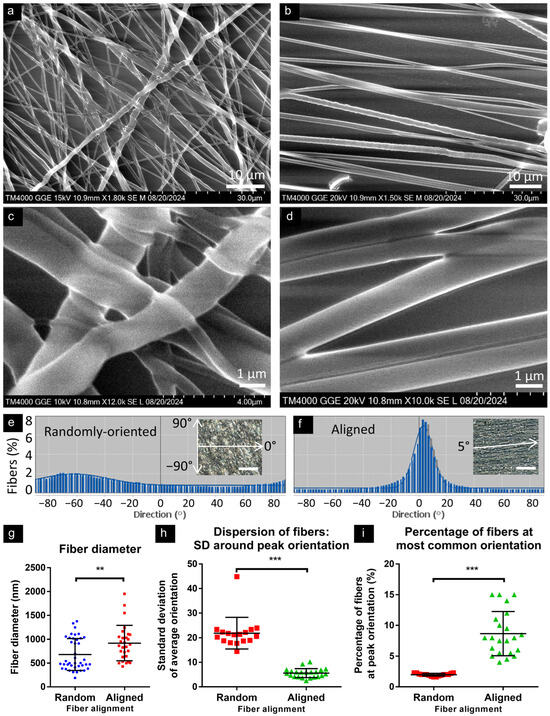 Fibers were readily visualized through both light and electron microscopy and were clearly identifiable as either randomly oriented or (highly) aligned at all magnifications (Figure 1a–d). Directionality assessments were consistent with the construct descriptions as random and aligned orientations, with aligned constructs exhibiting clear peaks on histograms (Figure 1e,f). Fiber diameters were measured in electron micrographs (random: mean 681 ± 335 nm; aligned: 919 ± 371 nm; Figure 1g). Both formats contained nanofibers and microfibers, with random constructs having a greater prevalence of fibers with a diameter <500 nm (48% vs. 11%). The dispersion of fibers (range of fiber orientations) was greater in random constructs (Figure 1h), and the magnitude of the peak (highest percentage of fibers at a single orientation) was greater in aligned constructs (Figure 1i).