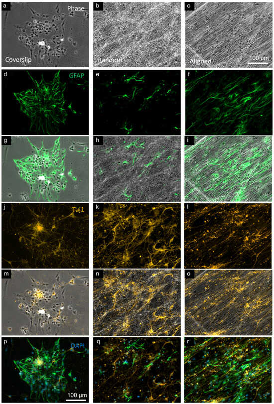 Fluorescence micrographs of neural co-cultures on glass and PCL fibers. (a–c) Phase contrast micrographs comparing neural co-cultures on coverslips, then randomly oriented fibers, and aligned fibers. Counterpart micrographs in each column then show GFAP (d–f), GFAP-phase merge to indicate astrocyte association with fibers (g–i), Tuj1 (j–l), Tuj1-phase merge to indicate neuronal association with fibers (m–o), and GFAP-Tuj1-DAPI merge (p–r) to show nuclei (DAPI+). GFAP: glial fibrillary acidic protein, astrocyte marker; PCL: polycaprolactone; Tuj1: neuronal marker.