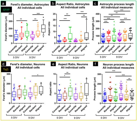Astrocytes and neurons on PCL fibers exhibited elongated morphologies. Box and whisker (10–90%) plots showing Feret’s diameter, aspect ratio, and process length, for GFAP+ cells (green box) and Tuj1+ cells (orange box). (a) Astrocyte Feret’s diameter was greater on aligned constructs (5- and 9DIV vs. coverslips). At 9DIV, it was also greater on randomly oriented constructs vs. coverslips. (b) Astrocyte aspect ratio (length/width) was greater on aligned constructs (vs. coverslips and random; 5- and 9DIV). (c) Average astrocyte process length was greater on fibers (aligned vs. coverslips, random vs. coverslips; 5- and 9DIV). All substrates showed greater process length at 9DIV vs. 5DIV. (d) Neuronal Feret’s diameter was greater on aligned constructs at 9DIV (vs. coverslips), but otherwise no differences were detected. (e) Neuronal aspect ratio was greater on aligned constructs (vs. coverslips and random) at 5DIV, but not at 9DIV. Average aspect ratio did not increase over time for any substrate. (f) Average neurite length was greater at 9DIV (vs. 5DIV) for coverslips and aligned constructs. It was also greater on aligned constructs vs. random at 9DIV. All stats: Kruskal–Wallis with Dunn’s post-tests; * p < 0.05; ** p < 0.01; *** p < 0.001.