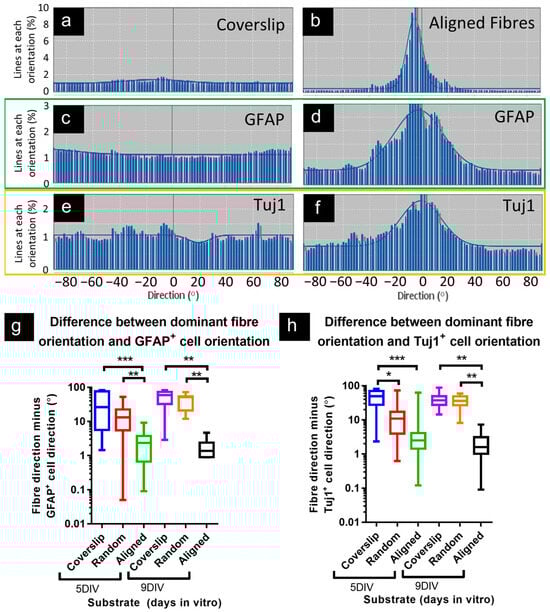 Astrocyte and neuron elongation matched the orientation of aligned fiber constructs. Directionality histograms show even distribution of orientations in coverslip cultures for (a) phase contrast, (b) GFAP, and (c) Tuj1 micrographs, consistent with cells extending in all directions approximately equally. However, strong peaks of orientation were present in histograms for aligned fiber constructs, with the peak in (d) phase contrast micrographs (fibers) matching the peaks in counterpart channels for (e) GFAP and (f) Tuj1. (g) Taking peak direction of orientation (°) for phase contrast micrographs, and subtracting the peak orientation for GFAP counterpart micrographs, showed smaller differences for aligned constructs vs. coverslips and vs. randomly oriented fibers, at both 5- and 9DIV. (h) Tuj1 micrographs more closely matched fiber orientation in aligned constructs at 5DIV (vs. coverslips) and at 9DIV (vs. coverslips and random). (a–f) are representative histograms from counterpart micrographs. (g,h) * p < 0.05; ** p < 0.01; *** p < 0.001; unpaired Kruskal–Wallis, Dunn’s post-test; n = 16, 16, 18, 10, 7, 5 individual image sets across cultures; plotted with log10 y-axis, due to the wide spread of data points.