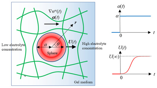 We consider the following assumptions: (i) The liquid is treated as incompressible. (ii) The applied electrolyte concentration gradient field α(t) is sufficiently weak such that both the particle velocity U(t) and the liquid velocity u(r, t) remain proportional to α(t). This allows us to neglect the terms involving the square of the liquid velocity in the Navier-Stokes equation. (iii) The slipping plane, defined as the plane where the liquid velocity u(r, t) at position r (r, 0, 0) relative to the particle velocity is zero, coincides with the particle surface at r = a. Here, r represents the radial distance from the particle center. (iv) Electrolyte ions cannot penetrate the particle surface. (v) In the absence of α(t), the electrolyte ion distribution follows the Boltzmann distribution, and the equilibrium potential Ψ(0)(r) is governed by the Poisson-Boltzmann equation. (vi) The relative permittivity εp of the particle is much lower than that of the surrounding electrolyte solution εr (εp « εr), making εp nearly negligible. (vii) The Brinkman-Debye-Bueche continuum medium model [32,33] is employed, in which the polymer segments are regarded as resistance centers, exerting frictional forces with a frictional coefficient γ on the liquid flowing through the gel medium.