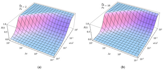 Figure 2 presents a 3D plot of R(t) as a function of the scaled particle radius λa and the scaled time νt/a2, calculated using Equation (75) for two values of the particle-to-solution mass density ratio ρp/ρ0, that is, ρp/ρ0 = 2 (a) and 10 (b).