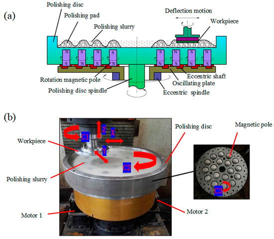 The processing principle and self-constructed device used for the test are shown in Figure 1. The entire polishing disc is driven to rotate by its spindle, and a cylindrical small magnet is located under the polishing disc. A magnetorheological polishing slurry consists of carbonyl iron powder, abrasive particles, dispersants, stabilisers, H2O2, and deionised water, which are used to fill the polishing-disc surface. The magnetic particles in the polishing slurry form a chain string structure under the action of an applied magnetic field, and the abrasive particles are clamped or constrained between the magnetic chain strings to form a flexible magnetorheological effect polishing pad. The workpiece is mounted on the spindle of the machine, and the clearance between the workpiece and the polishing disc is adjusted so that the workpiece contacts the flexible polishing pad and produces relative rotation. During this process, the SiC surface is continuously oxidised and removed, resulting in the efficient processing of SiC.