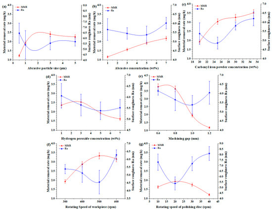 MRR and Ra influence trends of the (a) abrasive size, (b) abrasive concentration, (c) carbonyl iron powder concentration, (d) H2O2 concentration, (e) machining gap, (f) workpiece speed, and (g) polishing-disc speed.
