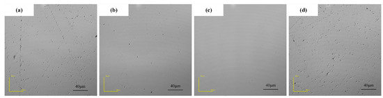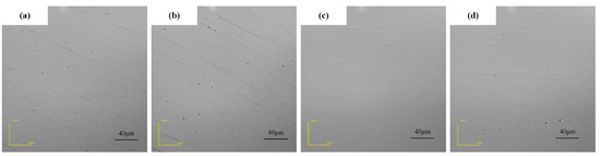 As shown in Figure 2b, the MRR increases gradually with increasing abrasive mass fraction, whereas the corresponding change in surface roughness Ra first decreases but then increases. In addition, the surface roughness decreases when the abrasive mass fraction is 5%. Combined with the surface morphology after polishing (Figure 3), when the abrasive concentration is low, the number of effective actions of the abrasive is small, the mechanical removal effect is weak [22], and the grinding scratches remaining in the previous stage of the process are difficult to remove (as shown in Figure 3a,b). With increasing abrasive concentration, the mechanical removal ability increases. When the mechanical removal effect is gradually balanced with chemical action, the best polishing quality is obtained (as shown in Figure 3c). However, when the abrasive concentration exceeds a certain range, the magnetic particles on the abrasive of the constraints are affected [23]. This causes local damage to the surface in the form of pits, resulting in a slight increase in surface roughness (as shown in Figure 3d).