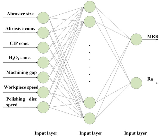 The BP neural network mainly contains an input layer, a hidden layer, and an output layer. The parameters of the abrasive grain size, abrasive grain concentration, carbonyl iron powder concentration, H2O2 concentration, machining gap, workpiece rotational speed, and polishing-disc rotational speed are taken as the input layers of the neural network model; i.e., the number of nodes in the input layer is seven. The MRR and the roughness of the polished surface are taken as the output layer; i.e., the number of nodes in the output layer is two. The number of hidden layers influences the complexity and expressive ability of the neural network, and there is no clear selection criterion for the number of nodes in the hidden layer; however, it is related to the number of nodes in the input/output layer. Different empirical formulas are usually used to guide the selection of the number of nodes of the hidden layer, and in the actual selection, an approximate range is determined via Equations (6)–(8), and the optimal number of nodes is subsequently determined via a trial-and-error method [32,33,34].