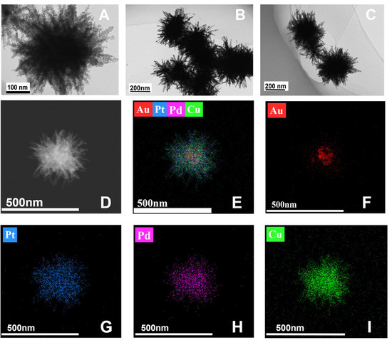 Figure 3A–C presents TEM images of the AuPtPdCu NPs. It can be seen that the prepared AuPtPdCu NP is in the shape of a three-dimensional sea urchin. According to the element mapping (Figure 3D–I), Au was mainly distributed on the inner part of the sea urchin-like structures, while Pt (blue signal), Pd (purple signal), and Cu (green signal) were dispersed throughout the structure, as can be seen from the three-dimensional structure of the AuPtPdCu NPs. Most of the Pd and Pt atoms can be observed on the branches of the nanoparticles. This multi-metallic configuration is expected to significantly enhance the catalytic activity of the nanoparticles.