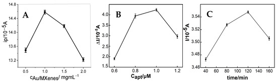 Various parameters, including the Au/Ti3C2 concentration, aptamer concentration, and incubation time, significantly influence the experimental outcomes. Consequently, these conditions were systematically optimized to enhance the reliability and accuracy of the detection conditions of the immunosensor proposed in this study. From Figure 5A, it can be seen that the Au/Ti3C2 concentration is an important factor that influences the behavior of the immunosensor. When the concentration of Au/Ti3C2 increased from 0 to 1.0 mg mL−1, the current response of the immunosensor increased during exosome detection, indicating that more exosomes were captured by the aptamer loaded onto Au/Ti3C2. However, the peak current decreased when the concentration of Au/Ti3C2 exceeded 1.0 mg mL−1 due to the increased thickness of the Au/Ti3C2 film, which hindered electron transfer. Therefore, 1.0 mg mL−1 Au/Ti3C2 was selected for the following experiments.