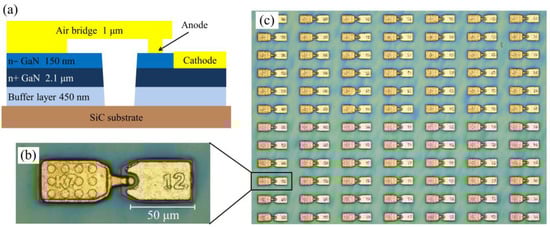 The irradiation damage in GaN is determined by a complex interplay between irradiation parameters (type, energy, and dose) and material properties (carrier density, impurity content, and dislocation density), such as the carrier removal effect due to trapping of carriers into radiation-induced defects varies depending on the growth method of GaN layers [18]. Metal–organic chemical vapor deposition (MOCVD) technology is a widely used technique for epitaxial GaN growth, which is attributable to low inherent defect density, appropriate epitaxial growth rate, and cost-effectiveness. The low intrinsic defect density of GaN materials grown using this method can effectively mitigate the carrier removal effect caused by irradiation. The designed GaN-based THz SBD is shown in Figure 1. The GaN materials used in this work were grown on a 2-inch silicon carbide (SiC) substrate by MOCVD. The GaN epitaxial layers consist of a 450 nm high-resistance (HR) buffer layer, a 2.1 μm n+-GaN layer (doping concentration of 1019 cm−3), and a 150 nm n−-GaN layer (with a doping concentration of 5 × 1017 cm−3). Fabrication of GaN-based THz SBD mainly involves four steps: (1) GaN materials were dry etched onto SiC substrates to achieve mesa isolation using inductively coupled plasma (ICP); (2) the cathode metals of Ti/Al/Ni/Au (20/120/50/80 nm) were deposited on n+-GaN layer by electron-beam evaporation (EBE), followed by rapid thermal annealing in the N2 environment to form the ohmic contact; (3) the anode metals of Ni/Au (50/100 nm) were deposited on the n−-GaN layer by EBE to form the Schottky contact, with an anode diameter of 6 μm; (4) the gold air bridge (thickness of 1 μm) was achieved by the electroplating technique, as shown in Figure 1b,c.