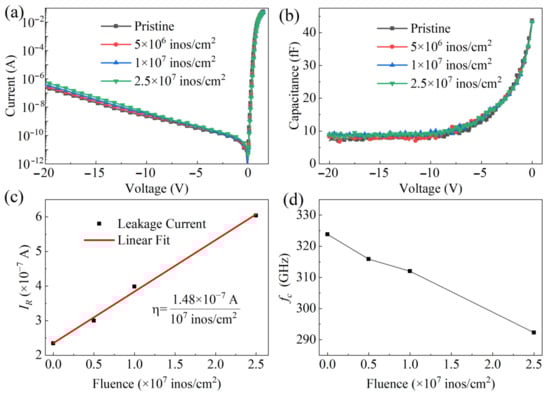 The Rs and C0 were extracted from forward I-V and C-V data, respectively, and the fc of GaN-based THz SBDs for varying irradiation fluences were calculated in Figure 2d. As the irradiation fluence increases, the fc of GaN-based THz SBDs decreases, with a 4% reduction in fc observed at Kr SHI irradiation fluence of 107 ions/cm2. The continuous degradation of device performance was accompanied by a sustained increase in the irradiation fluence.