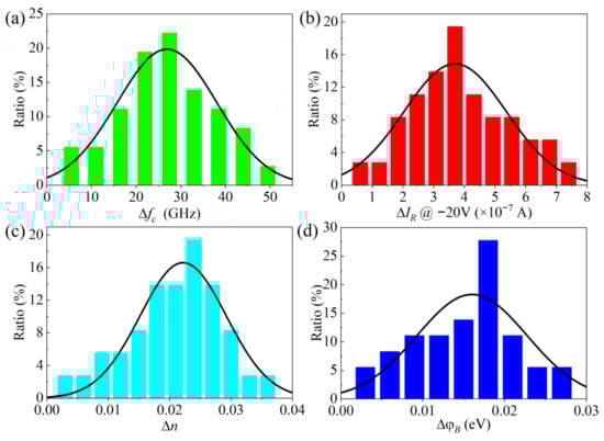 The degradation distribution of (a) Δfc, (b) ΔIR, (c) Δn, and (d) ΔφB of 50 GaN-based THz SBDs before and after irradiation.