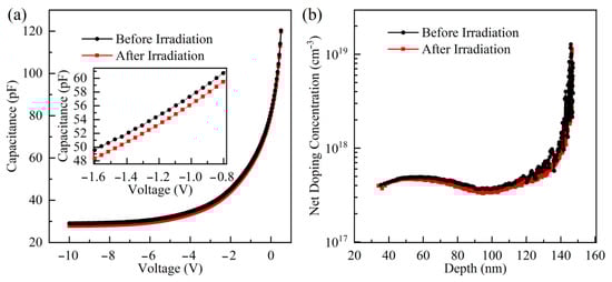(a) C-V characteristics of GaN SBDs before and after irradiation, and (b) net doping concentration profile as a function of depth derived from these C-V measurements.