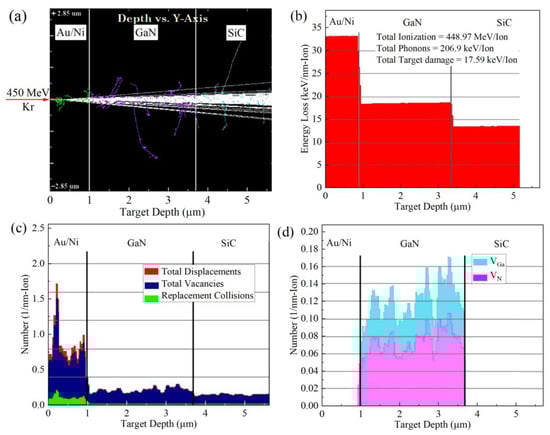 (a) Trajectories of 450 MeV Kr ions in GaN-based THz SBDs, (b) variation in electronic energy loss vs. ions’ path length in Au/Ni/GaN/SiC target, (c) distribution of displacement losses and (d) vacancy concentration (VGa and VN) in the GaN epitaxial layer for 450 MeV Kr ions in GaN-based THz SBDs.