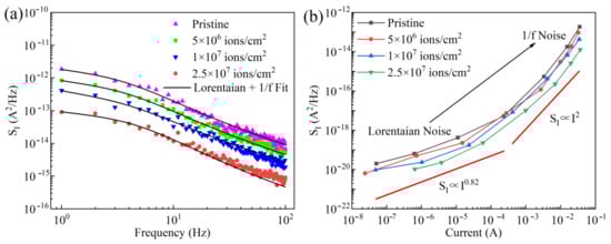 Figure 6b displays the contrast of the LFN with current for GaN-based THz SBDs with and without Kr SHI irradiation. Compared to pristine GaN-based THz SBDs, the irradiated devices exhibited relatively lower LFN power. The LFN at low current follows a relationship of SI∝I0.82, whereas it changes to SI∝I2 as the current increases. The LFN of GaN-based THz SBDs under forward bias exhibits a strong dependence on the Rs. At low current and high Rs conditions, LFN is dominated by Lorentzian noise, which is primarily attributed to interface defects at the Schottky metal–semiconductor junction. At high current and low Rs, changes in barrier height caused by the capture and release of electrons by defect states result in low-frequency 1/f noise [39,40].