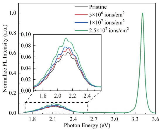 It is well known that the ET of GaN material is verified by the yellow luminescence (YL) in PL spectra [41,42,43]. To further investigate the generation of traps in GaN-based THz SBDs induced by Kr SHI irradiation, PL spectra were measured, as shown in Figure 7. The PL spectra of GaN epitaxial wafers were normalized to the peak intensity of the GaN bandgap (3.4 eV), and the wafers exhibited the same PL spectra both before and after Kr SHI irradiation. However, the PL intensity of YL decreases with increasing Kr SHI irradiation fluence, indicating that defects are introduced by the Kr SHI irradiation.