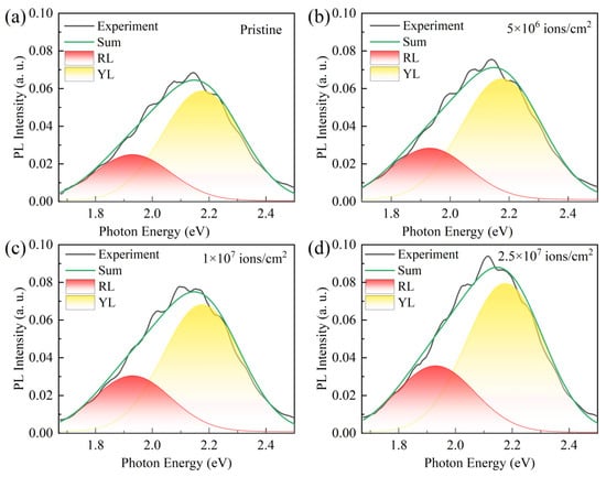 The PL spectrum of GaN material includes multiple emission peaks, such as the red luminescence (RL) peak at 1.93 eV and the YL peak at 2.2 eV. To better investigate the effect of Kr SHI irradiation fluence on the PL characteristics of GaN material, two Gaussian functions were employed to fit the PL spectra of the GaN epitaxial layers both before and after Kr SHI irradiation, as presented in Figure 8. The RL and YL emissions involve a possible transition mechanism associated with the recombination of donor–acceptor pairs during trap energy-level transitions [44,45]. As shown in Figure 8a, unirradiated GaN epitaxial wafer exhibits RL and YL spectra, which are attributable to inherent defects within the GaN material. As illustrated in Figure 8b–d, the intensity of RL and YL increases with the rising Kr SHI irradiation fluence, which is attributed to the defect formation caused by irradiation damage.