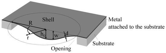 Before presenting the numerical model developed in this work, it is instructive to briefly review the approach used in [9] to fabricate axisymmetric bistable micro shells with a circular horizontal projection of radius R, central height and thickness d, as shown in Figure 1. First, free-hanging circular, flat, thin Al sheets are prepared by the following process. The Al metal layer is deposited (sputtered) on a silicon wafer, Figure 2a. A circular opening is deep reactive ion-etched (DRIE) in the substrate, with the metal film serving as the etch stop, Figure 2b. This results in a suspended circular metal flat plate clamped along its perimeter. The final shape of the shell is achieved by pressing a soft punch, consisting of a foam layer, over the entire area of the Si die, including the thin suspended metal sheet, Figure 2c. Since the foam layer is not patterned and covers the entire area of the substrate, including the cavity, there is no need for a preshaped three-dimensional punch or mold, the need for alignment with the openings in the substrate is eliminated and multiple devices can be processed simultaneously.