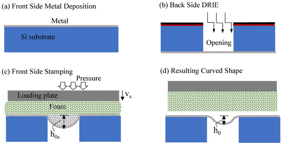 Fabrication process flow [9]. (a) Structural metal layer deposition on the front side of the Si wafer. (b) Opening of a cavity in the back side of the substrate by deep reactive ion etch with the front-side metal layer serving as the etch stop. (c) FS soft-foam self-molding stamping. (d) Residual curved shape.