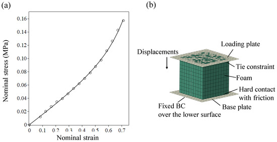 To support the validity of the adjusted material model and parameters, an FE model of the compression test was conducted, as shown in Figure 3b. The foam specimen was modeled by 35486 3D solid full-integration eight-node brick elements with three linear interpolation functions (C3D8), which enable easier treatment of contact problems. The element number was chosen through a convergence test. The base plate and the loading plate were modeled by rigid shell elements (R3D4). The normal-to-surface interaction between the foam bottom and its support was modeled by a “hard” contact, which minimizes the penetration of the slave surface into the master surface. The tangential interaction was characterized by a friction coefficient, which equals , as examination of the effect of this parameter on the analysis results showed small sensitivity with respect to variation between 0 and 1. The interaction between the foam top and the loading plate to which it is glued was modeled using a “tie constraint”, guaranteeing continuity of the normal displacements and vanishing tangential displacements, namely no sliding. The loading simulation was carried out by application of displacements to the loading plate, similar to those measured in the experiment. The predictions of the 3D FE analysis compare well with the test results, as exhibited in Figure 3a.