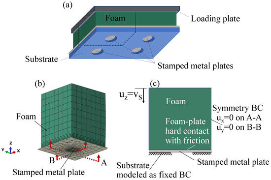 The FE model to be established should reflect the behavior of two deformable bodies, the soft foam punch and the circular clamped metal sheet, and their interaction. Thus, suitable constitutive relations for both the stamp foam and the plate metallic material should be adopted.