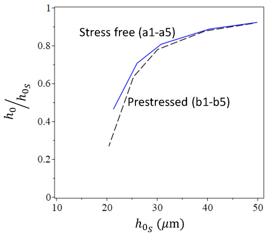 Role of the membrane prestresses. Cases corresponding to the above-considered ones, while including uniformly distributed equal radial and circumferential prestresses MPa, are presented in the third column of Table 2 and in Figure 5b and Figure 6b. Curves showing the variation in the residual-to-peak stamping height relations with the increase in the stamping pressure (which can be represented by either or ) for the two groups are presented in Figure 7. The curves indicate that there is a threshold value of , guaranteeing nonzero , that this threshold value is larger in the presence of prestress and that the effect of the prestress is reduced when increasing the stamping pressure, namely when stamping shells of larger residual heights. In such a case, the irreversible deformation induced during stamping first increases the plate size to make it cover the opening while flat and stress-free, while only the development of further deformation enables the nonplanar form. Nevertheless, the difference between the residual deformation of prestressed and initially stress-free cases becomes less significant as the stamping pressure is increased, inducing larger inelastic deformations.