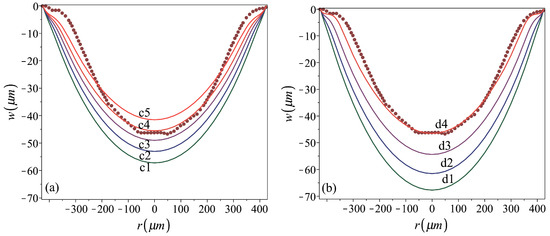 Sensitivity of the residual profile to Young’s modulus of (a) stress-free plates, cases c1–c5, and (b) prestressed to 130 MPa plates, cases d1–d4. Fabrication and material parameters for the analyzed cases are given in Table 3. The dark red dotted line represents the stamped shell profile [9].