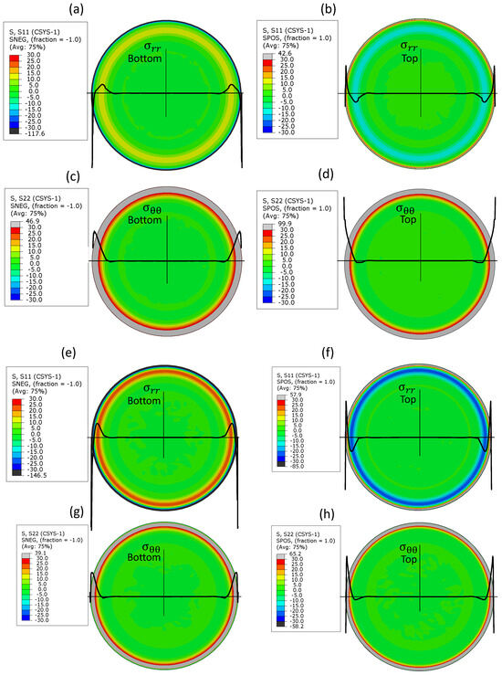Post-stamping residual stresses (MPa) in (a–d) shell d4 and (e–h) shell b5. Radial residual stresses on the (a,e) lower and (b,f) upper surfaces. Tangential residual stresses on the (c,g) lower and (d,h) upper surfaces. Solid thick black lines on the colored maps represent the stress profile.
