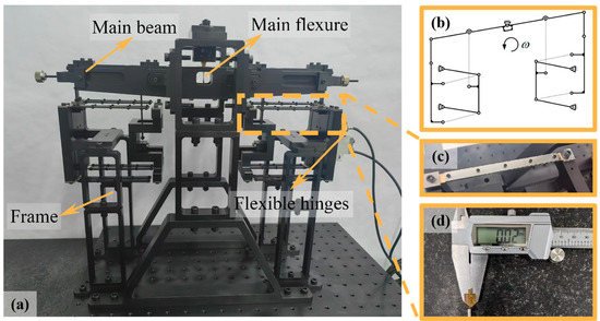 Structural diagram of the force measurement, guiding mechanism, and leaf spring-type flexible hinges in the energy balance system: (a) overall schematic diagram of the energy balance system, (b) schematic diagram of the motion principle, (c) magnified view of one of the 13-level flexible hinges, and (d) measurement of the 20 μm thickness of the leaf spring using a vernier caliper.
