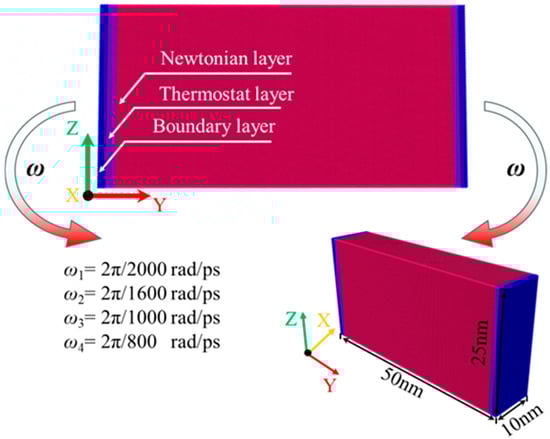 The molecular dynamics (MD) bending simulation model of the flexure-type flexible hinge, as shown in Figure 2, used single-crystal copper (Cu) with a lattice constant of 3.615 Å. The MD model dimensions were 100 Å × 500 Å × 250 Å, containing approximately 1,066,464 atoms. Although this scale was substantially smaller than that of actual flexible hinges, the micro-mechanisms studied still provided a basis for understanding the behavior of similar materials in macro-applications. The crystal orientations along the X-, Y-, and Z-axis of the MD model were [100], [010], and [001], respectively. The bending simulation model was divided into three regions: the Newton layer, the thermostat layer, and the fixed layer. In the Newton layer, atoms underwent primary deformation, following Newton’s laws, using the velocity Verlet method [30]. The thermostat layer maintained a constant temperature of 293 K, regulated by the Berendsen thermostat [31]. Atoms in the fixed layer retained the initial parameters to support the system. To minimize size effects, periodic boundary conditions (PBCs) were applied in the X-, Y-, and Z-axis.