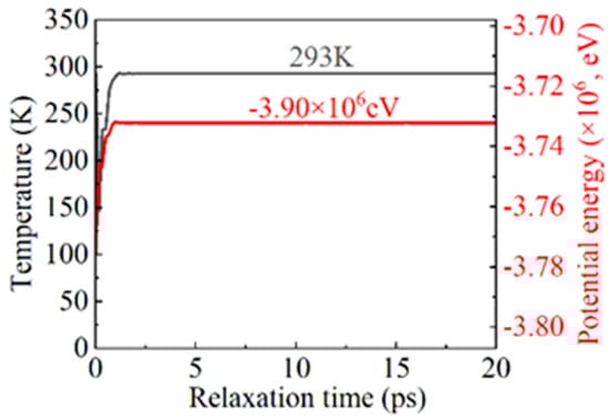 The MD simulation of bending primarily included the relaxation phase and the bending phase. In the relaxation phase, the system underwent energy minimization using the conjugate gradient method [32], followed by relaxation in an isothermal–isobaric ensemble (NPT) at a temperature of 293 K and a pressure of 1 atm for a duration of 20 ps.The relaxation results, shown in Figure 3, indicated a gradual decrease in both the system temperature and the total potential energy until stabilization, with the temperature stabilizing at 293 K and the total potential energy reaching −3.90 × 106 eV. This suggests that, during relaxation, the system gradually attained a stable state as the microstructure adapted, reducing local stress concentrations to achieve equilibrium. In the bending phase, the model underwent a bending simulation in a constant-energy ensemble (NVE) with an applied bending torque. The two ends rotated at opposing angular velocities, with angular velocities of ω1 = ±2π/2000 rad/ps, ω2 = ±2π/1600 rad/ps, ω3 = ±2π/1200 rad/ps, and ω4 = ±2π/800 rad/ps, where ω1 through ω4 progressively increased. The bending axis was centered on the model and aligned parallel to the X-axis. The bending phase durations were set to 200 ps, 160 ps, 120 ps, and 100 ps for each respective bending rate, ensuring a total bending angle of 2π/5 rad (referred to as T for the complete bending process in this work). This angle range satisfied the requirements for analyzing the full operational and failure behavior of plate spring-type flexible hinges. A timestep of 1 fs was used, and strain and mean square displacement (MSD) were continuously monitored and recorded throughout the bending process. The bending simulation MD model was executed using the Large-scale Atomic/Molecular Massively Parallel Simulator (LAMMPS) [33]. The MD simulation parameters are provided in Table 1. In addition, the simulated file data were visualized and analyzed by OVITO.
