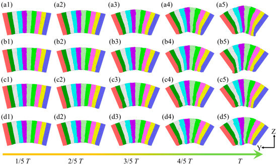 Figure 4 illustrates the plastic deformation of plate spring flexible hinges under different bending rates. For the ease of observation and comparison, the model is divided into 10 equal sections along the Z-axis. The results indicate that, despite variations in the bending rate, the overall deformation trend of the system remains consistent across four different rates. As the bending angle increases, the atoms at the top of the sample progressively extend, while those at the bottom undergo compression and extrusion, resulting in irregular curvatures and atomic accumulation. Horstemeyer et al. [40] studied the plastic response of single-crystal copper under stress via bending experiments, revealing that stress can induce deformation wave propagation in materials, a phenomenon comparable to the plastic deformation process of the flexible hinge at different bending rates in this work. At the bending rate ω1, as shown in Figure 4a, initial deformation in the system is observed during the 0~1/5 T phase. In the subsequent 2/5 T~3/5 T bending stage, atomic extension at the top of the sample continues, while atoms at the bottom further compress, forming a relatively smooth bending curvature. As the bending angle reaches 4/5 T~T, the atomic extension at the top and compression at the bottom become more pronounced, with the bottom curvature tending toward irregularity. A similar deformation behavior is also observed under higher bending rates, such as ω3 and ω4, as depicted in Figure 4(c5,d5).