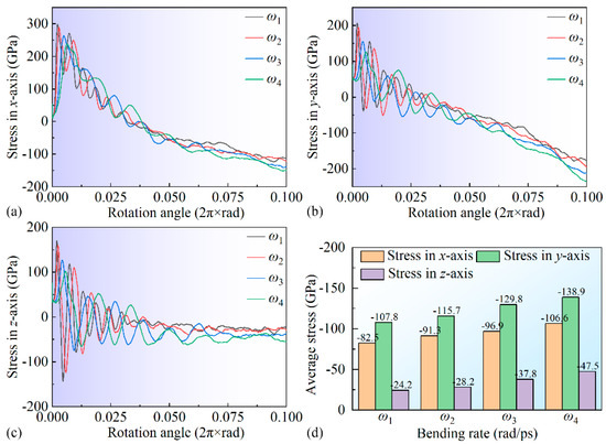 Figure 5 illustrates the stress variation curves of the leaf spring-type flexible hinge under different bending rates, where positive values indicate tensile stress, and negative values indicate compressive stress. During bending, the tensile stress along the X-axis gradually increases in the 0~1/5 T phase, reaching a peak of approximately 300 GPa, before gradually decreasing. Around 1/2 T, the tensile stress transitions to compressive stress, which continues to increase during bending and ultimately reaches around −120 GPa. This finding indicates a significant transition between tensile and compressive stress in the flexible leaf spring hinge during bending, likely a critical factor contributing to failure in its operational use. The Y-axis stress follows a similar pattern, exhibiting a transition from tensile to compressive stress around 1/3 T, after which the compressive stress gradually increases, ultimately reaching approximately −200 GPa. Notably, this direction also shows a pronounced transition between tensile and compressive stress. Stress–strain curves in the X-, Y-, and Z-axis reveal distinct stress oscillations associated with dislocation slip due to crystalline structural defects within the material. These high-stress regions may be a primary cause of fatigue failure in the flexible hinge, especially in areas of frequent stress oscillations, where stress concentration leads to cumulative structural damage. Averaging the stress–strain curves across all three axes yields the results shown in Figure 5d, indicating that the average stress in all three directions during bending primarily exhibits compressive stress, which increases significantly with rising bending rates.