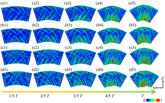 Defect evolution within the leaf spring-type flexible hinge under various bending rates, with (a1–d5) corresponding to ω1 = 2π/2000 rad/ps, ω2 = 2π/1600 rad/ps, ω3 = 2π/1200 rad/ps, and ω4 = 2π/800 rad/ps.