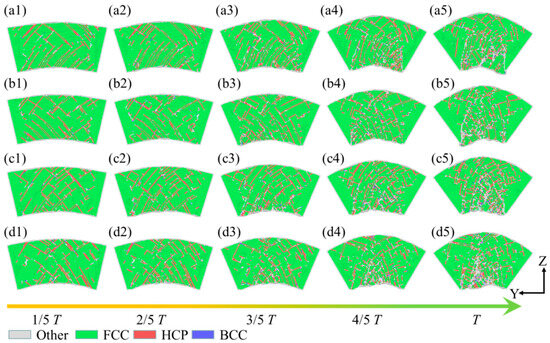 During the bending simulation, the effect of different bending curvatures on the structural evolution within the curved segments of the plate spring flexible hinge was analyzed across various bending rates. Figure 7 presents the evolution of the internal structure of the plate spring flexible hinge under different bending rates and curvatures, analyzed using common neighbor analysis (CNA). When the bending curvature reached 1/5 T, the stable FCC crystal structure within the hinge experienced orientational rearrangement under stress, leading to the emergence of defect structures with HCP crystal patterns in the middle and on both sides of the hinge. These defects, primarily represented by intrinsic stacking faults (ISFs) and extrinsic stacking faults (ESFs), slid along the {111} crystal planes in the [110] direction, as shown in Figure 7(a1). This structural transformation indicated a local reduction in the material’s resistance to tensile stress, potentially leading to instability and fatigue damage. With an increasing curvature, the internal curved structures in the plate spring flexible hinge grew more prevalent, and stacking faults continued to expand inward. When the curvature reached 4/5 T, amorphization appeared at the bottom of the specimen, forming an amorphous structure as FCC atoms decreased further, as shown in Figure 7(a4). At full curvature (T), amorphous structures became more prominent, and the FCC crystal structure further diminished, as seen in Figure 7(a5). At higher bending rates, although fewer internal structures were initially observed at a bending curvature of 1/5 T, the internal structure progressively increased with curvature, with significant amorphous formation at full curvature, as shown in Figure 7b. With higher bending rates, the internal structure within the plate spring flexible hinge markedly increased as the curvature grew, with stacking faults spreading further into the material and FCC atoms continuously decreasing, and this may have also caused fatigue damage to the leaf spring flexible hinge during operation. As the bending rate increased, the evolution of the internal structure exhibited notable changes, with more pronounced differences as the curvature intensified, as illustrated in Figure 7c,d.
