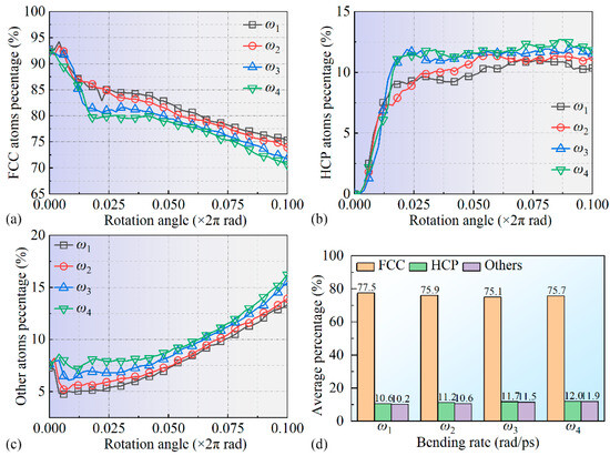 Figure 8 shows the variation curves of atomic ratios with amorphous, FCC, and HCP crystal structures under different bending rates. Note that the BCC crystal structure atoms present in the system were omitted during statistical analysis. It was observed that, as bending progressed, the trend in percentage changes in atoms with FCC, HCP, and amorphous structures remained generally similar under different bending rates, though the degree of change varied. During the 0–1/5 T phase, the proportion of FCC structure atoms in the system decreased significantly, indicating that the stable FCC crystal structure was disrupted due to the surface’s bending process. Zheng et al. [41] also noted structural instability and amorphization in crystals under stress, which may explain the observed FCC-to-amorphous transformation trend under the high bending rates in this work. Notably, the changes in ω3 and ω4 were more pronounced than in ω1 and ω2, likely due to intensified atomic interactions at higher bending rates. Subsequently, in the 1/5 T~T phase, the proportion of FCC structure atoms in the system continued to gradually decrease, following an approximately linear trend, related to the continuous expansion of multilayer stacking faults, as shown in Figure 8a. At the end of the bending process, the residual FCC atomic ratios in the system were about 75%, 73%, 72%, and 71% for bending rates ω1, ω2, ω3, and ω4, respectively. During the 0–1/5 T phase, the percentage of HCP atoms within the system rapidly increased with bending, indicating a substantial transformation of FCC to HCP crystal structures, as shown in Figure 8a,b. In the 1/5 T~T phase, the percentage of HCP atoms stabilized, with maximum proportions of 10%, 11%, 11.5%, and 12% corresponding to bending rates ω1, ω2, ω3, and ω4, respectively, indicating that higher bending rates facilitated the formation and expansion of HCP defects, as shown in Figure 8b. Additionally, during the 0–1/5 T phase, the proportion of amorphous atoms remained low and changes minimally, while, in the 1/5 T~T phase, this proportion increased significantly, suggesting the amorphization of FCC atoms, as illustrated in Figure 8a,c. Higher bending rates further accelerated this amorphization process, as shown in Figure 8c. Xu et al. [42] found that dislocation activities under loading conditions could induce grain boundary sliding and structural transformation in nanocrystalline materials, consistent with the HCP and amorphous expansion trends observed under higher bending rates in this work. To quantify the crystal structure transformation process further, the crystal proportions during the 1/2 T~T phase were averaged, with the results presented in Figure 8d. These results indicate that intense FCC-to-HCP transformation occurred during the 0–1/5 T phase, while the FCC-to-amorphous transition dominated in the 1/5 T~T phase, with higher bending rates ω3 and ω4 further promoting both processes.