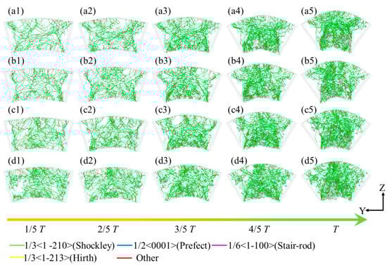 Figure 9 illustrates the derived dislocation line configurations within the leaf spring-type flexible hinge during bending simulation, obtained using the dislocation extraction algorithm (DXA). In this figure, the green, purple, blue, yellow, and red lines represent Shockley partial dislocations (1/3<1-210>), stair-rod partial dislocations (1/6<1-100>), perfect dislocations (1/2<0001>), Hirth partial dislocations (1/3<1-213>), and other dislocation types, respectively. A substantial presence of Shockley partial dislocations, along with fewer stair-rod, perfect, and Hirth partial dislocations, was observed within the system during bending, as depicted in Figure 9(a1). This indicated significant plastic deformation and crystal structure transformation within the specimen. The emergence of Shockley dislocations may have resulted from slip at the interface of tensile and compressive stresses, with their increase possibly leading to localized instability in the material. Lock dislocations typically formed when two dislocations with different Burgers vectors intersect and react, creating a sessile dislocation which can act as an obstacle to further dislocation motion. This could lead to increased stress concentrations and potentially influence the material’s failure mechanisms. As the bending strain intensifies, dislocations accumulate predominantly at the system’s top and bottom regions, corresponding to areas of pronounced plastic deformation, as shown in Figure 9(a5). Furthermore, as the bending speed gradually increases, the number of dislocation lines within the system also rises, as observed in Figure 9b–d. Higher bending rates induce a more intense stress concentration, enhancing nonlinear deformation and dislocation multiplication within the material. This rate-dependent behavior may affect the fatigue life of the material and provide insights for designing flexible hinges suited to various loading conditions.