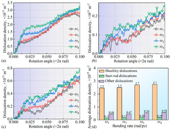 To further quantify the internal dislocation line variations in the system, the densities of various dislocation types were calculated, with the results shown in Figure 10. Shockley partial dislocations (a) and stair-rod partial dislocations (b) were analyzed individually, while all other dislocation lines were grouped as “other dislocations” (c). During the bending process, a significant increase in Shockley partial dislocations was observed in the 0–1/5 T stage. Under bending rates ω3 and ω4, the dislocation line density rapidly rose to 1.8 × 1015 m−2 and 1.3 × 1015 m−2, respectively, much higher than the 0.8 × 1015 m−2 observed under bending rates ω1 and ω2, indicating substantial microstructural changes within the system at this stage. Research by Sharma et al. [43] showed that dislocation density increases rapidly with changing loading conditions, accompanied by marked microstructural changes, consistent with the rapid increase in Shockley dislocation density under higher bending rates observed in this work. In the 1/5 T~T stage, the Shockley partial dislocation growth trend showed a near-linear increase, matching the phenomenon seen in Figure 8. Additionally, higher bending rates were found to promote dislocation line density in Shockley partial dislocations. Zheng et al. [44] found that under high-frequency vibration, the internal dislocation structure of materials evolves significantly due to external loading changes, a phenomenon similar to the dislocation density increase observed at high bending rates in this work, indicating that the loading rates may significantly influence the microstructure within a system. For stair-rod partial dislocations, the density consistently increased throughout the bending process across all bending rates, with ω3 and ω4 yielding slightly higher densities than ω1 and ω2, as shown in Figure 10b. Rajgarhia et al. [45] noted that, in plastic deformation, dislocation formation and accumulation are closely related to the loading rate, with higher rates accelerating dislocation density growth. This finding supports the increased stair-rod dislocation density observed under higher bending rates in this work. A similar trend is observed in Figure 10c for other dislocations, where higher bending rates promote density increases across dislocation types. To further quantify the dislocation line density evolution, the average densities of various dislocation types during the 1/2 T~T bending phase were calculated, as shown in Figure 10d. The results indicate that the system produced a substantial number of Shockley and stair-rod partial dislocations during the 0–1/5 T stage of bending, with a gradual increase in the dislocation line density throughout the process. Higher bending speeds further promoted dislocation line density accumulation within the system.