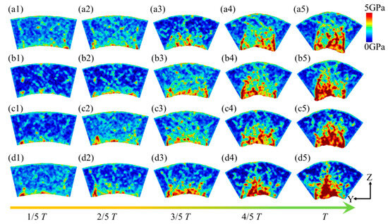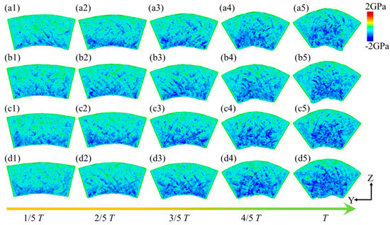 Hydrostatic stress distribution within the leaf spring-type flexible hinge under different bending rates, with (a1–d5) corresponding to ω1 = 2π/2000 rad/ps, ω2 = 2π/1600 rad/ps, ω3 = 2π/1200 rad/ps, and ω4 = 2π/800 rad/ps.