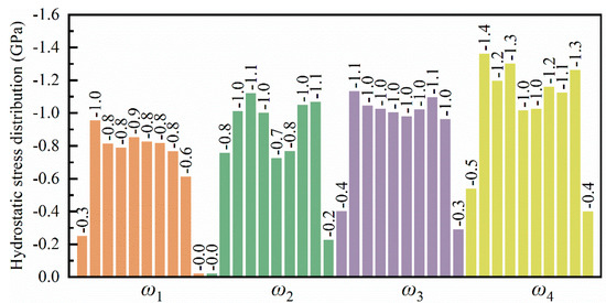 where E represents the Green–Lagrange strain tensor, F denotes the deformation gradient tensor, and I is the identity matrix. Hydrostatic stress [37] described the state where a point within a material experienced equal tensile stress in all directions, defined by the following equation: