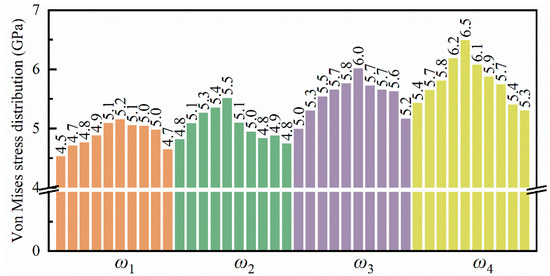 Compared to hydrostatic stress, von Mises stress comprehensively considers six stress components, which can more comprehensively characterize the stress state inside the workpiece. Figure 13 illustrates the von Mises stress distribution within the flexure hinge of the leaf spring type under varying bending rates. During the bending process, high-stress regions are primarily concentrated at the system’s base. As bending progresses, these high-stress areas gradually extend toward the central and upper sections of the system. The range of high-stress regions expands accordingly, with values ranging from approximately 4.7 GPa to 5.2 GPa. Moreover, higher bending rates lead to an increase in both the extent and rate of stress propagation, consistent with the observations in Figure 11. Figure 14 depicts the average von Mises stress distribution at the bending limit position within the system for different bending rates. It reveals that von Mises stress is lower at both ends of the system while being higher in the central region, forming a stress gradient. Additionally, with increased bending rates, there is a marked rise in the von Mises stress distribution within the system.