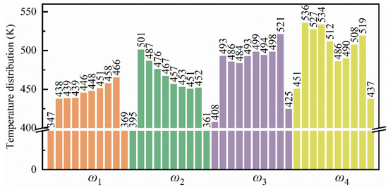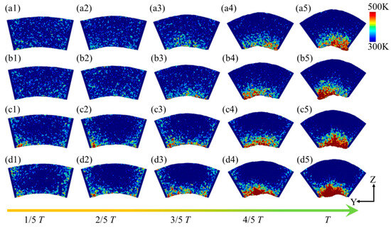 Figure 15 illustrates the temperature distribution within the flexure hinge of the leaf spring under varying bending rates. At low bending rates (ω1 and ω2), during the 0~2/5 T bending phase, no distinct high-temperature zones were observed within the system. However, as the bending degree progressed to the 2/5 T~3/5 T phase, a small high-temperature area emerged at the bottom of the system, with a temperature range of approximately 350 K to 370 K, as shown in Figure 15(a3). Cao et al. [48] demonstrated that temperature increases are closely associated with material strength degradation, suggesting that elevated temperatures in high-strain zones may heighten the risk of fatigue damage. In these high-temperature regions, atomic motion becomes more vigorous, leading to reduced lattice stability and potentially diminishing the fatigue performance of the material. This thermal effect may further destabilize the microstructure, thereby increasing the risk of fatigue damage. As the bending intensity increased further, high-temperature regions, approximately 470 K to 500 K, formed in areas of significant compressive deformation at the bottom of the system, as shown in Figure 15(a5). With the increasing bending rate, the high-temperature zones expanded gradually within the system, spreading from the specimen sides to areas of pronounced compressive deformation beneath the specimen, with temperatures ranging from 520 K to 590 K, as shown in Figure 15(b5–d5). This pattern indicates that both the extent and distribution of elevated temperatures within the specimen intensified with the increased bending rate and curvature, concentrating in regions of severe compressive deformation. The mean temperature distribution within the system at the extreme bending position under various bending rates is depicted in Figure 16, revealing a pronounced temperature gradient across the system. One to two high-temperature zones were observed, with distinct temperature gradients between the high- and low-temperature regions. As the bending rate increased, both the number of high-temperature zones and the system’s overall average temperature rose from approximately 430 K to 500 K.