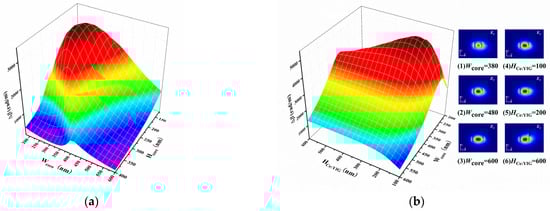 The trend in Δβ with changes in the core layer thickness and width is shown in Figure 2a. In the simulation, the initial settings are as follows: HCe:YIG = 100 nm and HYIG = 50 nm. When the Hcore is fixed, the Wcore first increases and then decreases; when the Wcore is fixed, the thickness variation follows a similar trend. In this simulation, Hcore = 220 nm (consistent with the standard SOI substrate) was selected, and the relationship between Δβ, Wcore, and HCe:YIG was calculated. As shown in Figure 2b, as Wcore increases, the change gradient of HCe:YIG becomes more gradual. At the same time, as HCe:YIG increases, Wcore consistently increases at first and then decreases. When HCe:YIG = 100 nm, the distribution of the Ex field along the x-direction in the TE0 mode was calculated, as shown in (1)–(3) in Figure 2b. As Wcore increases, the TE mode becomes primarily concentrated in the AlGaAs core layer, reducing the energy coupled into the MO material layer. This leads to a decrease in the Ex field gradient in the MO material layer, a smaller integration region, and consequently a reduction in Δβ. Additionally, for Wcore = 480 nm, the Ex field distribution was considered, as shown in (4)–(6) in Figure 2b. As HCe:YIG increases, the energy coupled into the MO material layer increases, the Ex field gradient becomes stronger, and the integration region expands, resulting in an increase in Δβ. After HCe:YIG = 200 nm, the Ex field is completely confined within the AlGaAs/MO layer, and no significant changes occur.