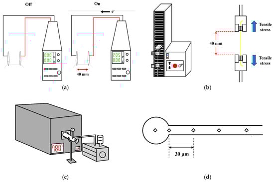 Schematic of experimental procedures: (a) I-V curve measurement and EFM test; (b) micro-tensile testing machine and tensile test; (c) vacuum furnace; and (d) hardness measurements in HAZ and FAB.