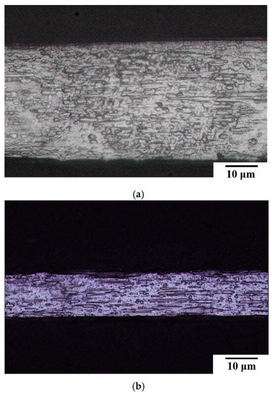 Figure 2a,b present the microstructures of two 304L stainless steel fine wires with different diameters. Both exhibit elongated grains aligned with the drawing direction, a characteristic morphology induced by the cold drawing process. The internal structures of both wires are dense and free of noticeable defects. Figure 2c presents the hardness comparison, revealing that 15SS has a higher hardness than 30SS. This is primarily due to its smaller diameter, indicating a greater degree of cold working and a higher work-hardening effect. Consequently, 15SS is also expected to exhibit higher strength than 30SS.