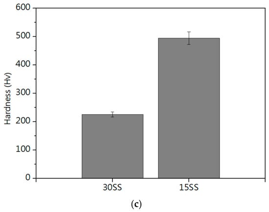 (a) Microstructure of 30SS; (b) microstructure of 15SS; and (c) micro-hardness of 30SS and 15SS.