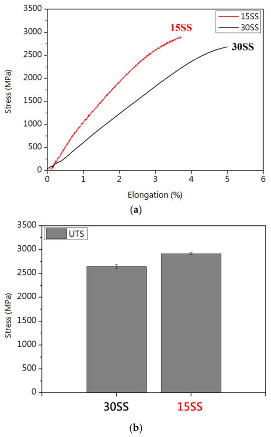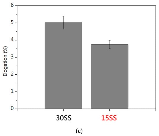 Tensile properties of 30SS and 15SS: (a) stress–strain curves; (b) tensile strength; and (c) elongation.
