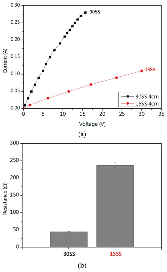 Electrical properties of 30SS and 15SS: (a) I-V curve; (b) resistance.